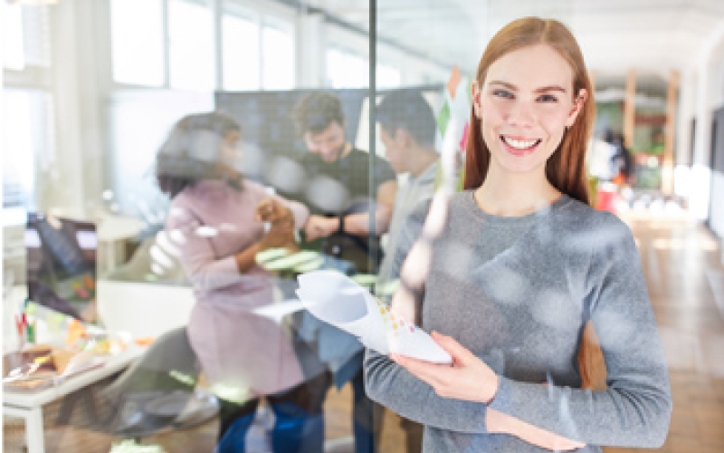 Eine Grafik von zwei Männern und einer Frau, die sich überdimensionale Puzzleteile reichen.